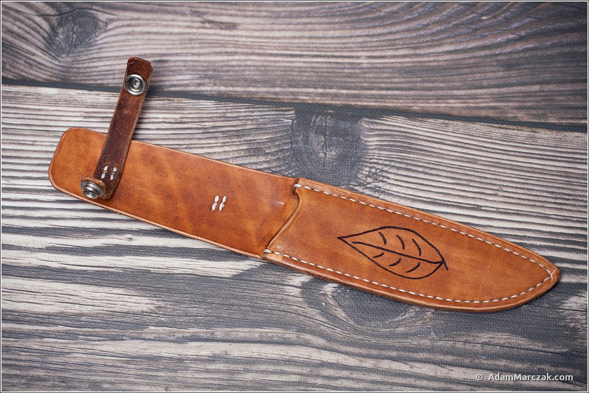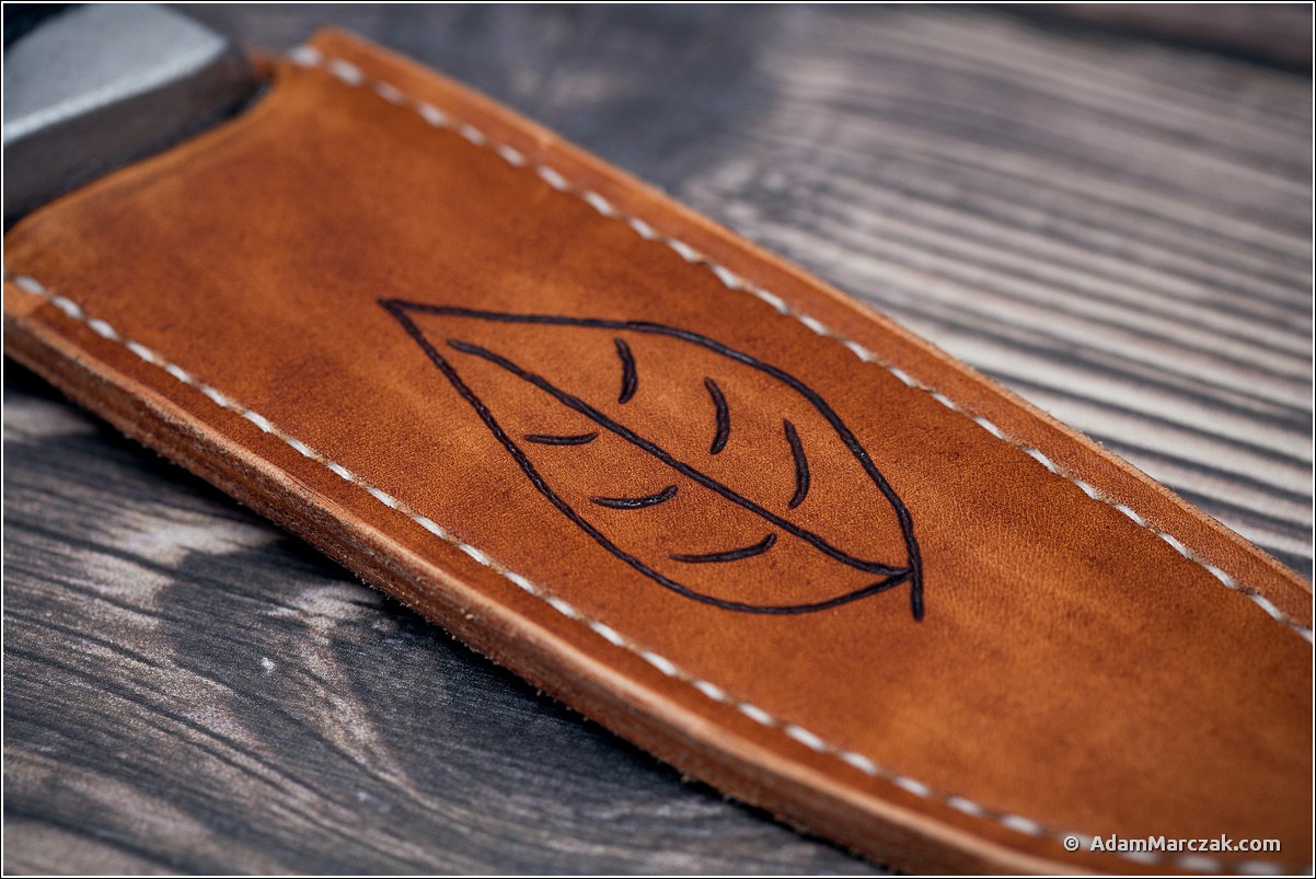 Pochwę wykonałem z grubej skóry bydlęcej licowej, którą delikatnie przybarwiłem na jasny brąz. Do tego na życzenie Damiana vel Miandas ozdobiłem ją artystycznie liściem. Tzn. wizualizacją liścia, bo zdobienie trzasnąłem wypalarką. Całość zabezpieczona – zaimpregnowana specjalnym tłuszczem do skór z domieszką wosku pszczelego.