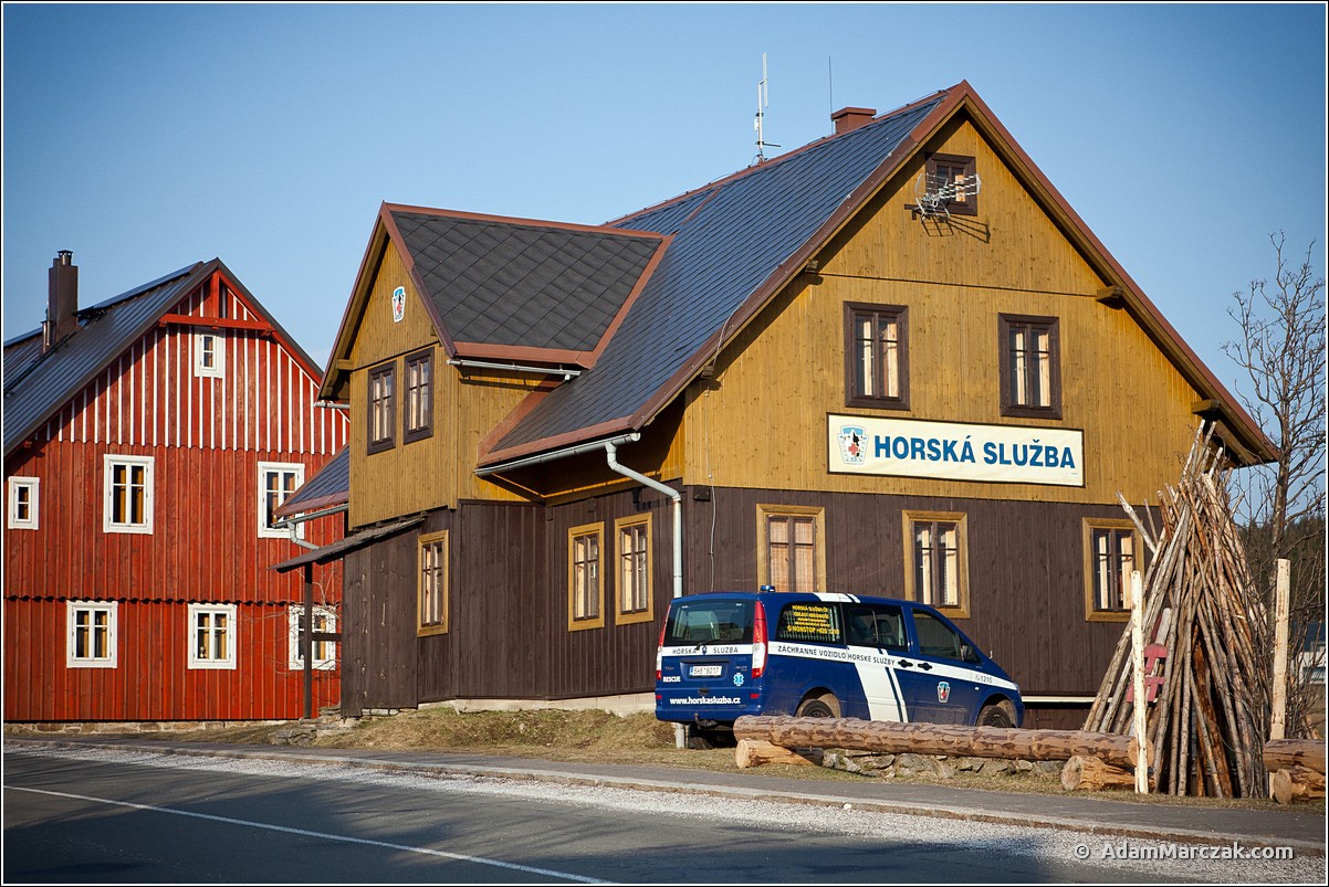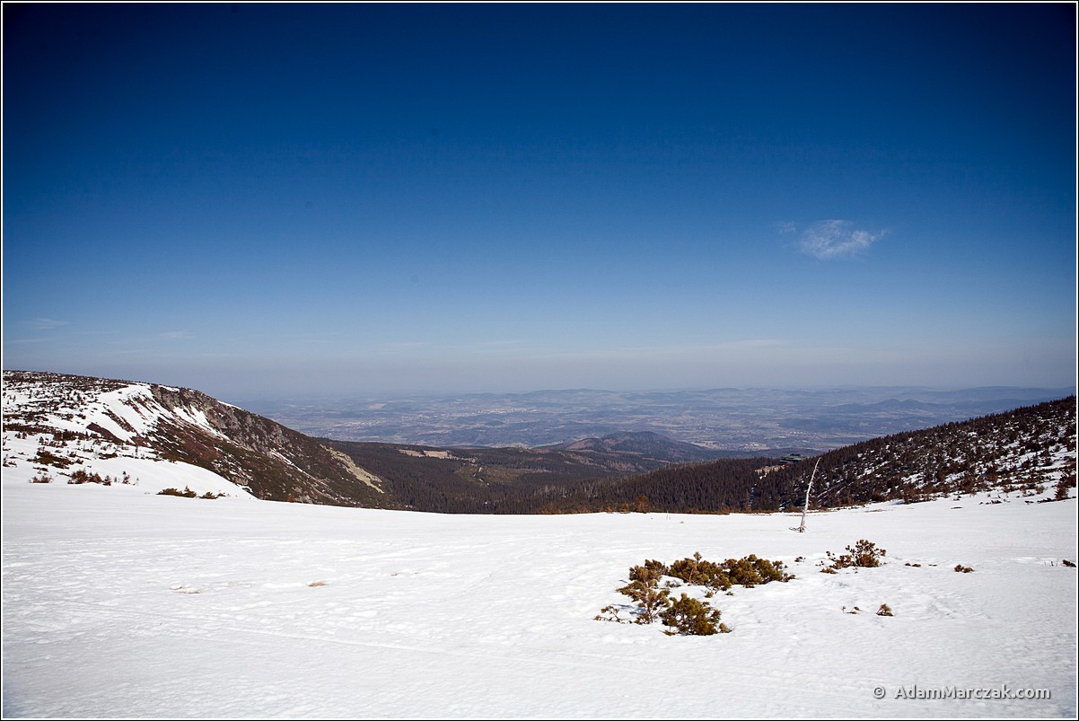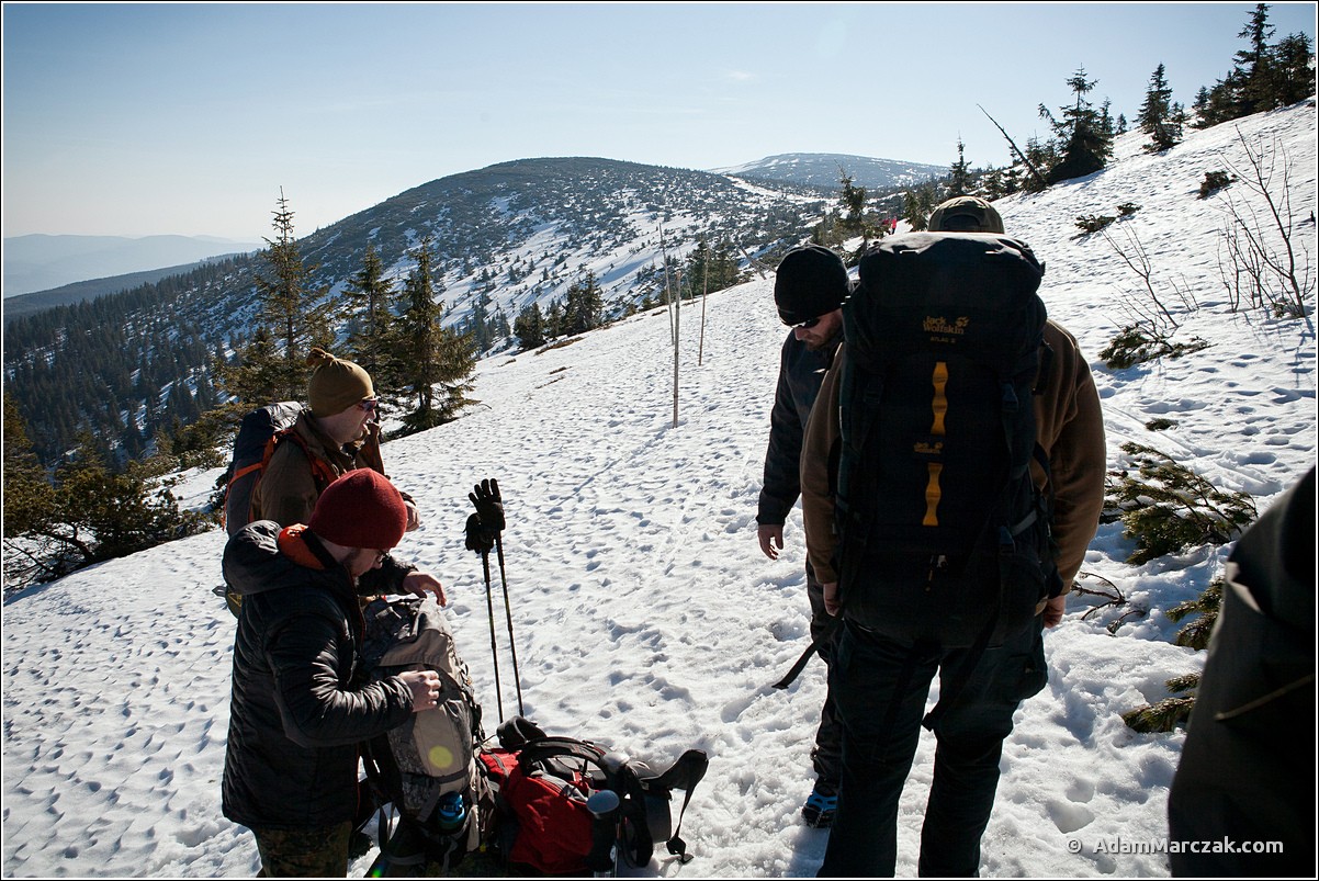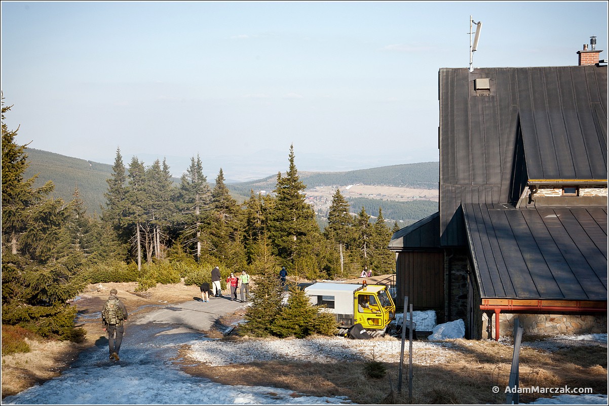 Po wypiciu Kofoli zakupionej w pocztowej placówce czeskiej stacji arktycznej na Śnieżce i posileniu się w równie czeskim Bistro postanowiliśmy jak najszybciej zejść w niższą partię gór ze względu na możliwość wystąpienia śnieżycy i skończenia się tlenu. Poza tym do pokonania mieliśmy jeszcze kilka dobrych kilometrów do obozu II (Schronisko PTTK Przełęcz Okraj).