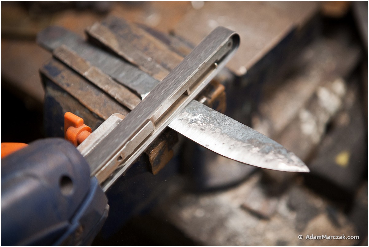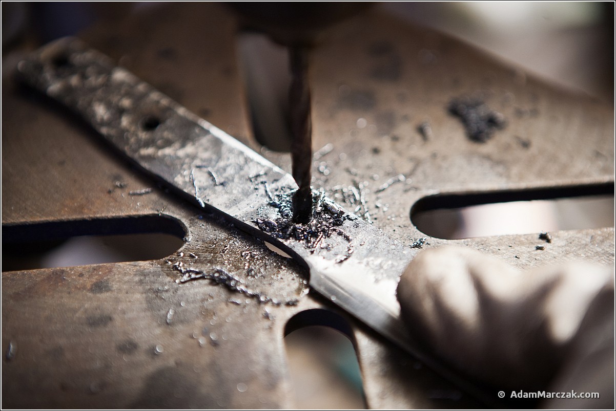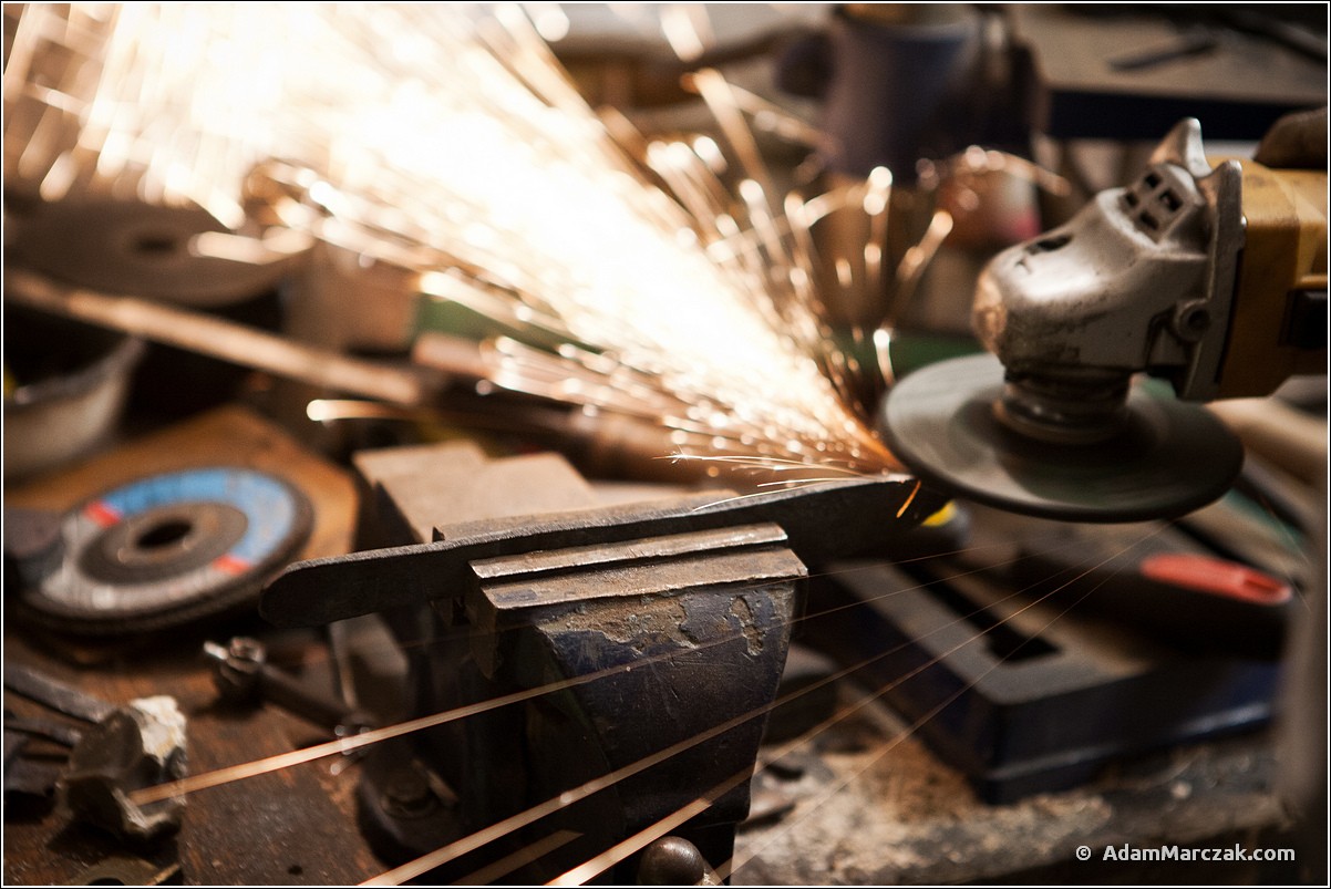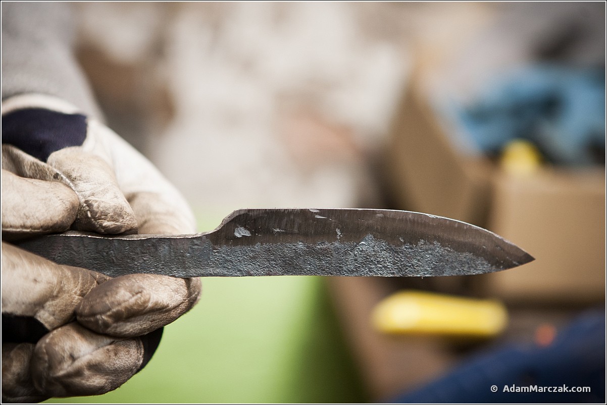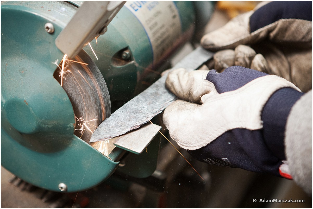 Po całej zabawie przy palenisku i kowadle czas jest na szlify. Obrobione kuciem stalowe blanki po długim, spokojnym wychłodzeniu traktowaliśmy szlifowaniem na kilka sposobów. Dla zabawy, nauki, etc. Do tego celu używaliśmy szlifierki stołowej, kątowej, pilnika elektrycznego, jak i zwykłego ręcznego pilnika, czy piłki do obcięcia nadmiary materiału.