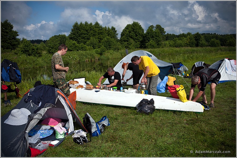 Sobotę z wynikiem dziennym około 28 kilometrów zakończyliśmy gdzieś na wysokości wsi Cieciory i Gietki. Na prawym brzegu trafiła się nam fajna łączka na skraju lasu. Tak jak poprzednio rozkładanie obozu poszło szybko i sprawnie. Ale tutaj pobiesiadowaliśmy zdecydowanie dłużej! Było wesoło!